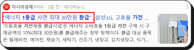 - 1등급 등 고효율 가전제품 구매 시, 10% 환급(최대 30만 원)